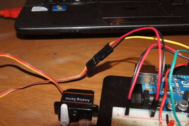 El Servo que he clavado a 5V y GND en el carril de la protoboard. La línea de datos que tengo al pin 9 en el Arduino.