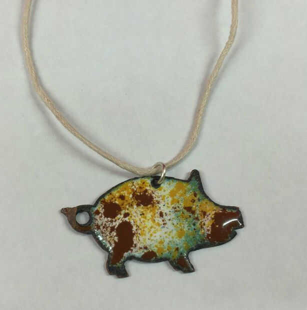 Hice un cerdo esmaltado como se indica. Éste utiliza esmalte rosado como la capa de base, con una dispersión de esmalte amarillo y marrón en la parte superior. Poner un anillo de salto a través del orificio en la parte trasera del cerdo, luego utiliza un pedazo de tanga para hacer un colgante.