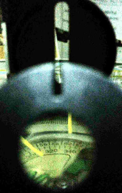 La lente ahora puede dar una imagen legible de figuras y escala como se muestra en la foto. La lente entonces se rechaza en la ficha negra sosteniendo en la brújula. La operación ha sido terminada a la derecha en esta condición como la lente se encuentra haber desarrollado escamas (probablemente debido a tensiones internas) y también se encuentran los cuatro tornillos que sujetan la placa base de plástico de material magnético (acero suave) haciendo la brújula inexacta cuando la aguja señala a cualquiera de los tornillos. Si no hubiera habido ninguna descamación, el procedimiento podría repetirse para dar un mucho mejor lente.