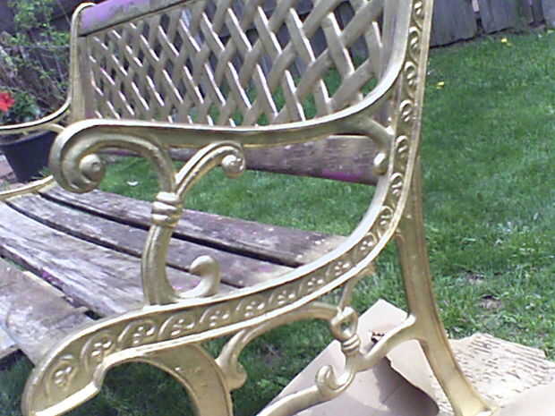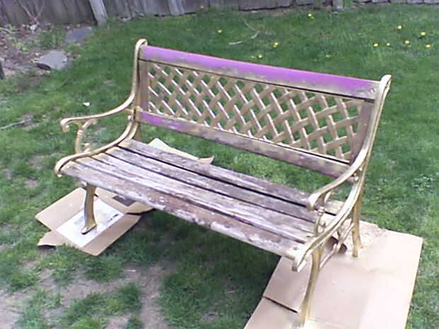 Primero raspar la pintura vieja de rosa escamosa en la madera tanto como pude con un cuchillo de mantequilla, y luego le di un buen lavado con la manguera para sacar viejos escombros de arbusto en las grietas en ambos lados. A continuación, mudamos a una zona más fácil para trabajar pintura y colocar cajas de cartón debajo de las patas del Banco en ambos lados. Spray pintura del metal de usted podría usar una mascarilla y guantes si quieres; Le di todo el metal que se podía ver una buena vez y dos veces más con la pintura de aerosol metálica de oro.