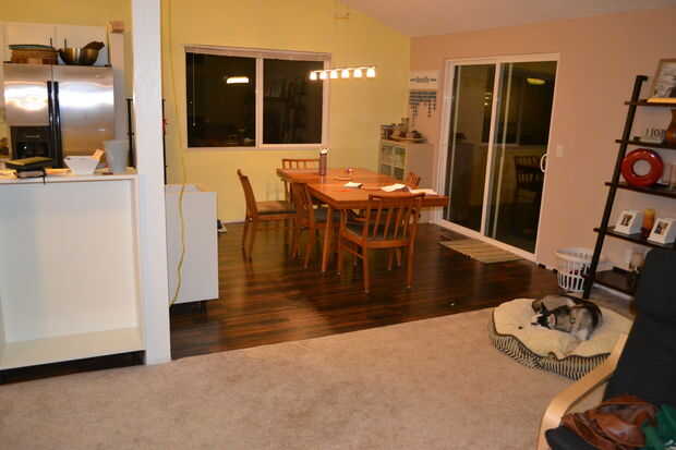 En esta parte los viejos pisos de linóleo y alfombras en la cocina y el comedor se eliminan a favor de un laminado de madera lengua y ranura de piso (T & G). Puesto que el piso viene con instrucciones y hay otras instrucciones bien hechos en toda la web no profundizar acerca de la instalación real y en cambio se centrará en algunos de la preparación, no se encuentra en las instrucciones básicas y consejos recogido en el camino.