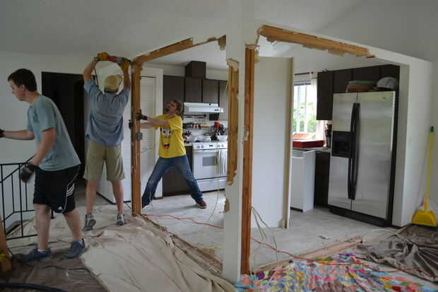 Inserte la hoja de la sierra alternativa en la brecha entre un poste y el travesaño superior y corte los clavos sosteniendo el perno en su lugar. Repita esto para cada viga para eliminarse. Si no se asegura la pieza superior a la otra pared tenga cuidado cuando corte el último par de pernos prisioneros.