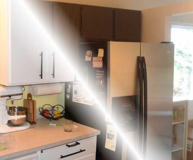 En esta parte damos a la cocina un aspecto nuevo y fresco por pintura y reemplazo de hardware en los armarios y gabinetes.