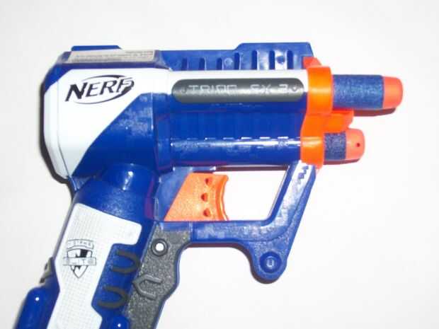 He modificado una Blastzooka extrema BuzzBee para disparar 6 Nerf dardos elite, estilo de la escopeta. Inicialmente lo hizo disparar dardos solo, pero era demasiado poderoso como para dejar que mis hijos utilizan. Deja ronchas en su cuerpo y también