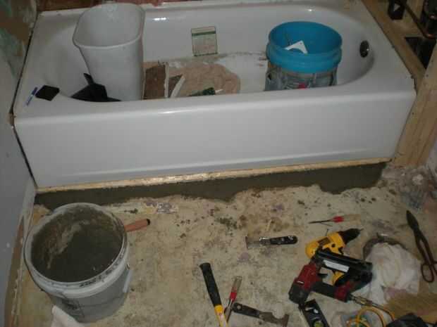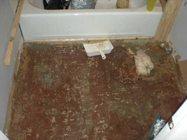 Originalmente quería tirar a tablero del cemento sobre el suelo existente, pero debajo de ese vinilo que resultó que tenía un piso de concreto grueso de varias pulgadas. No hay mejor superficie de hormigón y montaje del tablero del cemento en él habría sido un infierno de dolor. Así que llegué a estar varias horas en desechar el antiguo piso limpio. Ayuda de una pistola de calor, pero solamente tanto. Utilicé algunos concreto para llenar los vacíos alrededor de la tina, y entonces algunos compuesto de nivelación repartidas en todo el piso para estar listo para el embaldosado.