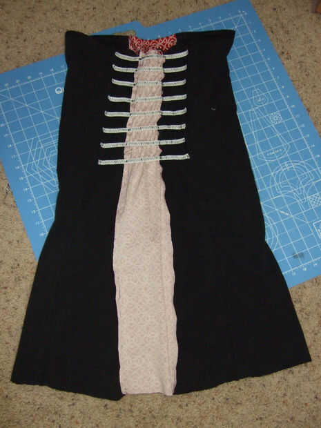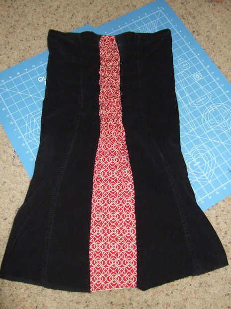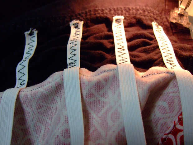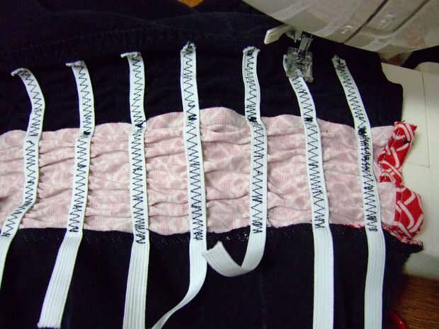 1. hemos añadido 4" los paneles de punto anterior. Proporciona cierta elasticidad cuando tirando el vestido sin tirar de un músculo. Sin embargo, un vestido suelto con vaqueros de pana no va a cubrir muy bien por lo que es la hora de añadir recoge. Tirar en el tubo y el sujetador fuera el exceso de tela - medir eso. Vamos a utilizar esa longitud a cortar tiras de elástico para que el vestido se ajuste mejor.