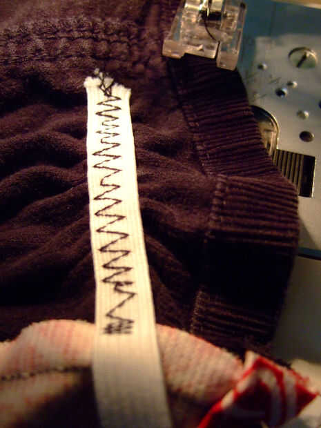 4. puntada tiras del elástico. Quizá deba cambiar bobinas si va a color-partido la rosca a la capa inferior. La mina en 3 partes - negro, rojo y blanco, luego negro bobina.