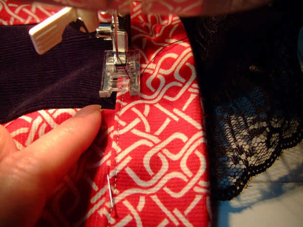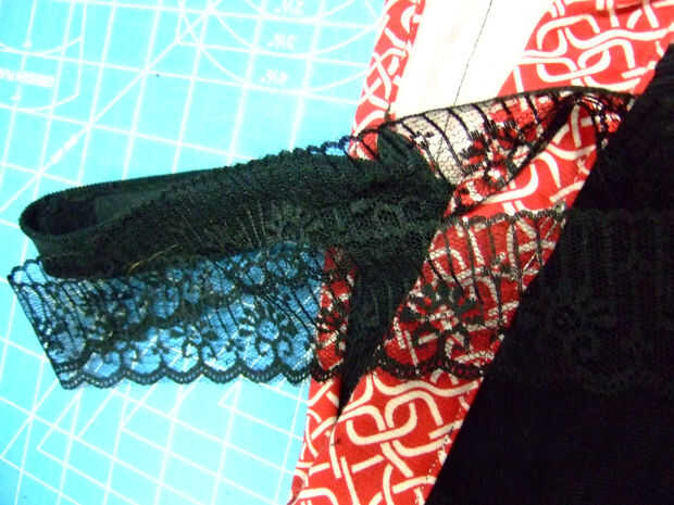 4. Añadir encaje a ambos lados de las correas y zig-zag de puntada en su lugar.