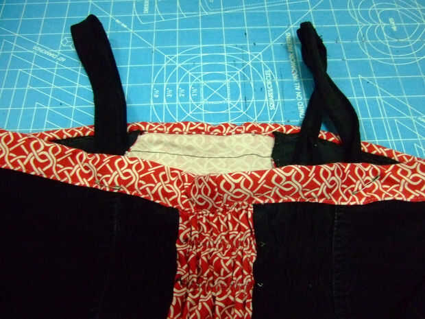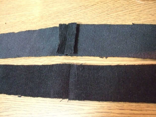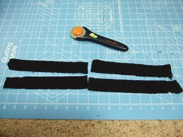 2. Cortar tiras de tela de los pantalones vaqueros de sobras con la medida del paso 1. Que tenga que cortar 4 tiras y coser dos juntos para conseguir una correa que es suficiente.