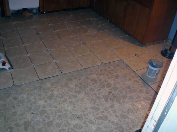Siendo que el linóleo estaba en bastante buenas condiciones y no pelado, simplemente decidí anotar un cúter y azulejo derecho sobre la parte superior. Incluso si vas esta ruta, probablemente desean asegurar el contrapiso existente a las vigas por debajo con una generosa cantidad de tornillos. Esto ayudará a eliminar la flexión y el potencial de fisuración azulejos. Como en el contador, mortero de pega y una paleta de 1/2" deben hacer el trabajo bien. El tamaño de los espaciadores del azulejo usado dependerá de su preferencia para el grueso de la lechada.