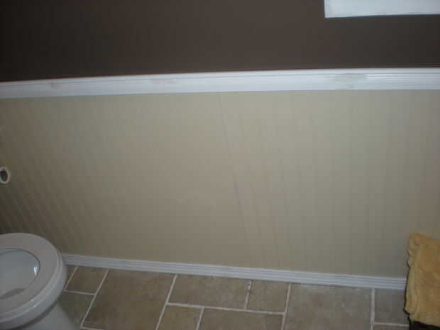 La moldura superior es MDF silla carril. Para ahorrar unos cuantos dólares buscan piezas que se dañan en el extremo. La mayoría de las ferreterías fácilmente estas marcar y solo se puede cortar hasta las piezas buenas. Esto funcionó bien ya que no tengo un solo 8' continua en el cuarto de baño entero. La moldura inferior es realmente dedo carcasa utilizados tradicionalmente alrededor de las ventanas, pero había un gran descuento en un paquete a granel por lo que trabajó tan bien. Me pinta la moldura antes de tiempo y fijarse con una clavadora de aire en los montantes (trate de marcar la ubicación de los postes de madera antes de que el revestimiento se va para arriba).