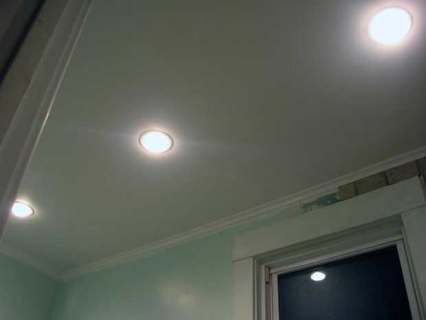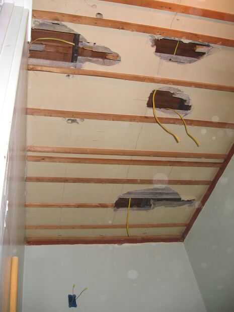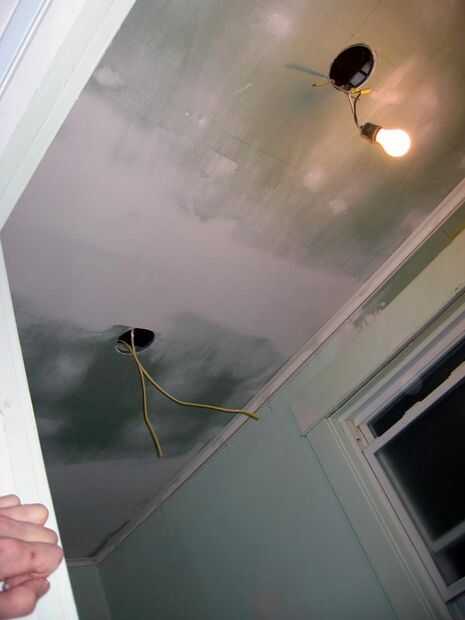 Greenboard es un tipo de yeso libre de yeso apto para uso en lugares húmedos como baños y eso es lo que he usado aquí. Luces pigtail darán una fuente temporal de luz durante el proceso de construcción. Así podría seguir adelante un acabado completamente el techo incluyendo pintura antes de proceder con el resto del proyecto, como lío sólo cae.
