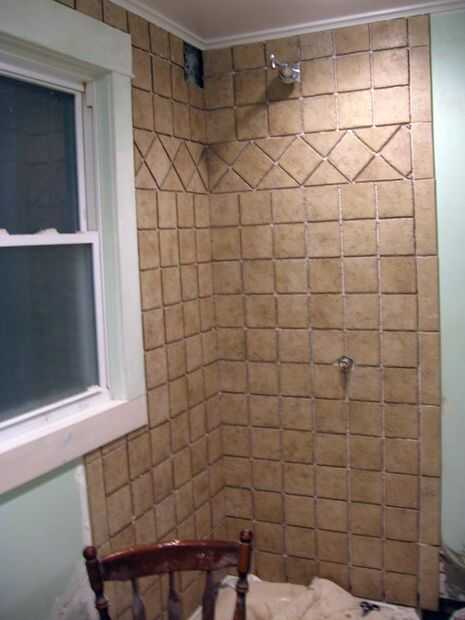 Este fue mi primer trabajo de mosaico y aprendí la manera dura que desea utilizar masilla orgánica, no mortero de pega en las paredes. Cuando su patrón de cepillado no tenga miedo de mezclar las cosas. No quería una cuadrícula básica aburrida así que agregando una fila de azulejos diagonales pudo crear un elemento arquitectónico interesante. El perímetro exterior se realizó utilizando azulejos de nariz de Toro. Este estilo de azulejos era el azulejo de la porcelana "hueso Toscano" de Lowes. Deje suficiente espacio entre la última fila de baldosas y la ducha para una línea de sellador.