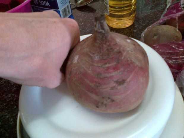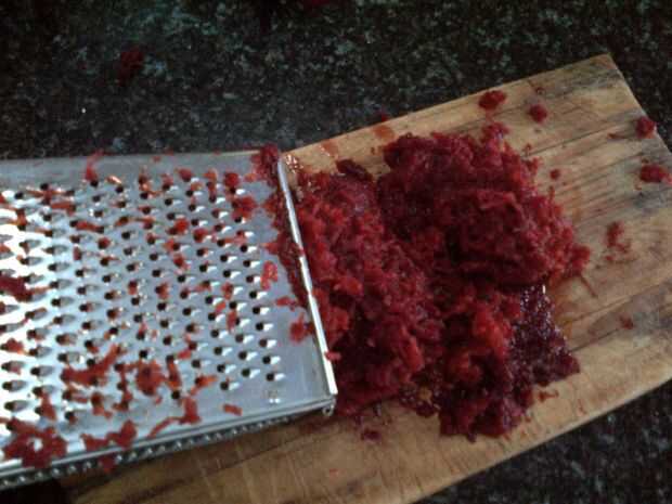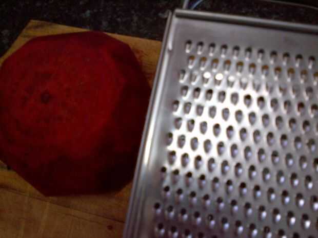 REMOLACHA pela y ralla en el lado fino del rallador... es el tamaño del agujero de un palo de fósforo