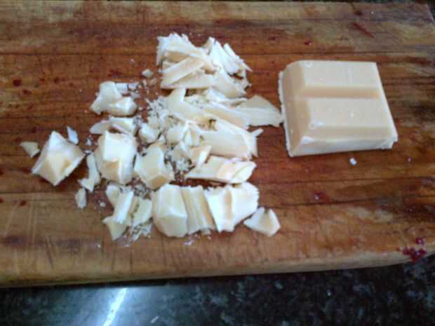 y luego picar de ruff CHOC blanco. comenzar en la esquina / enfrente de mano encima del cuchillo y baje lentamente