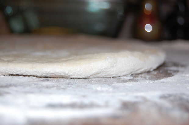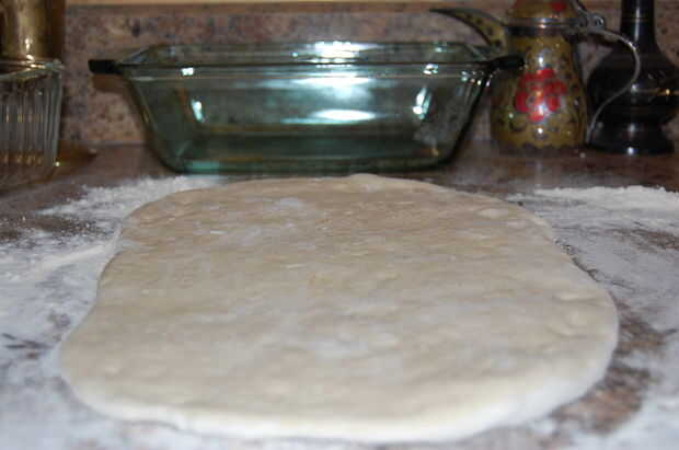 Luego estirar la masa.  Debe ser aproximadamente la anchura de la bandeja que vas a cocinar y forma rectangular.  Hace alrededor de 1/2 pulgada de espesor.