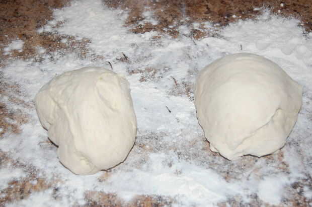 Harina de tu contador. Aplaste la masa y colocar sobre el mostrador.  Luego dividir la masa en dos trozos (más o menos supongo.  Debe ser lo suficientemente cerca).