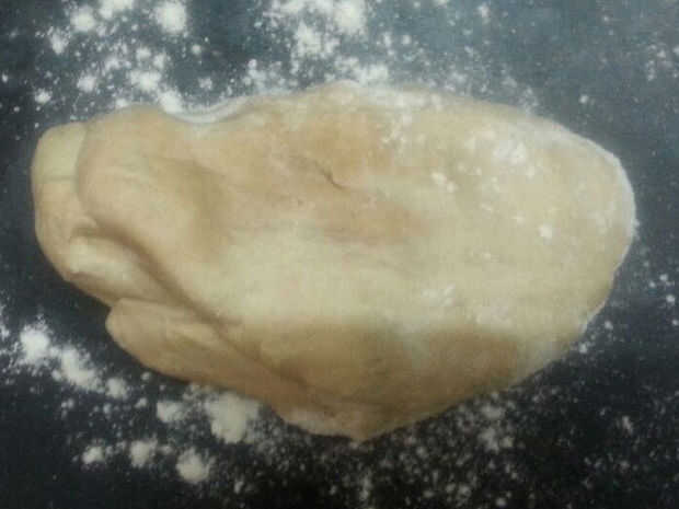 Después de una hora, tomarte y amasar. Espolvorear un poco de harina sobre la encimera y que se puede liar la masa sin que se pegue. Estirar la masa fina real y obtendrá más canela azúcar a morder en cada rebanada de remolino.