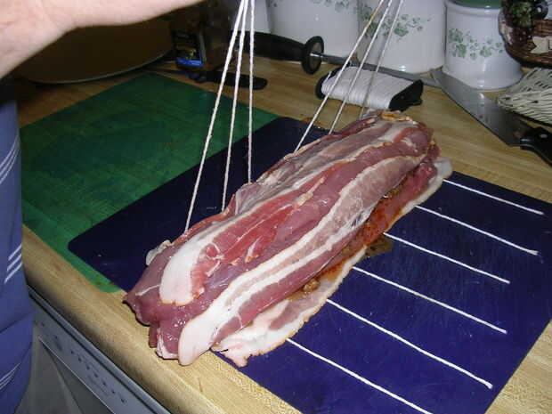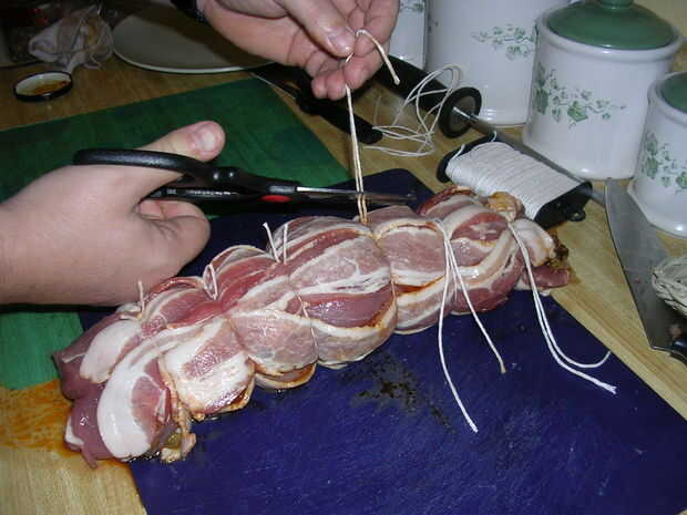 Preparación: 10 minutosTiempo de cocción: 1-2 horas (depende del tamaño del lomo)Ingredientes:6 libra cerdo León1 libra de tocinoFrotación de la parrillaAsí que fácil y deliciosa hacer!Paso 1: preparar Frotó el lomo con una frotación de parrilla comp