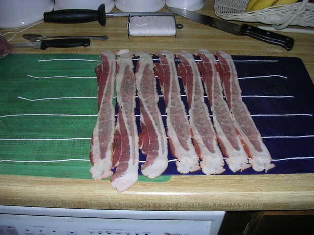 Oh mi Yum! Esto es algo que hacen bastante regularmente. Así de Simple!Paso 1: Prepárese Conseguir un lomo de cerdo (encontré uno que fue previamente marinado en Borbón y jarabe de arce!!! Santa mierda!!!)Colocar varias rodajas de tocino debajo de él