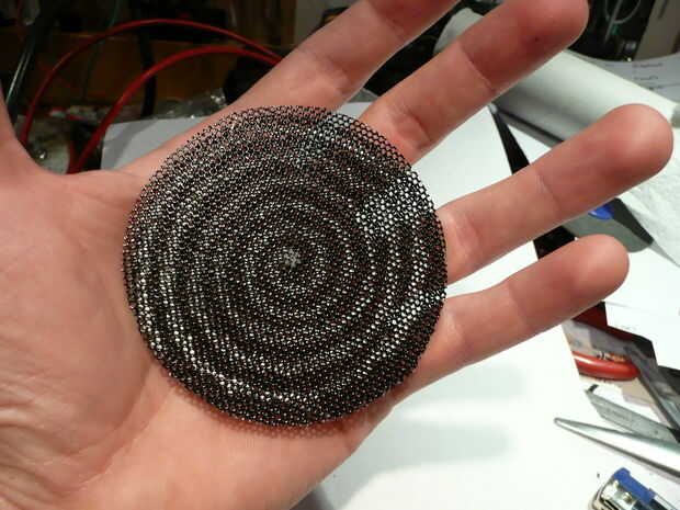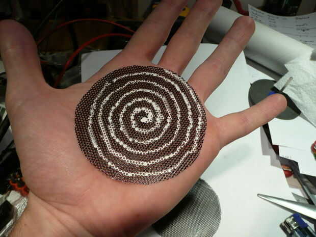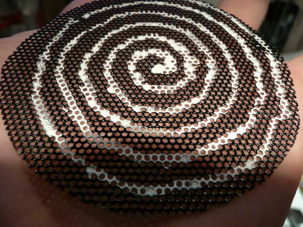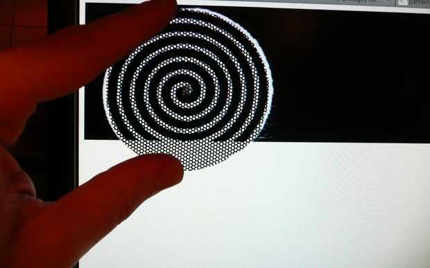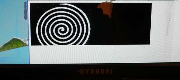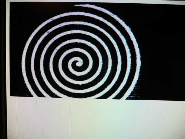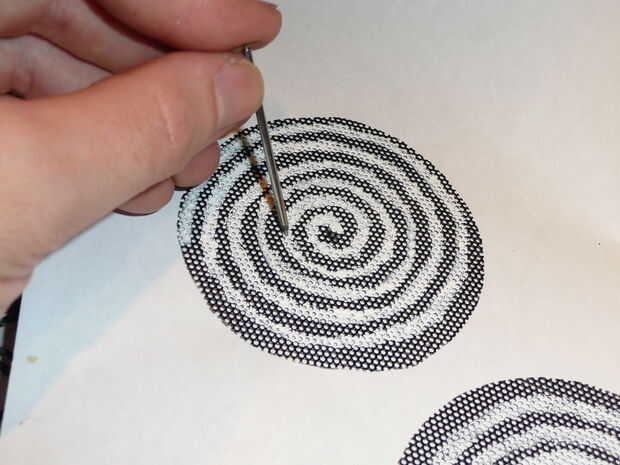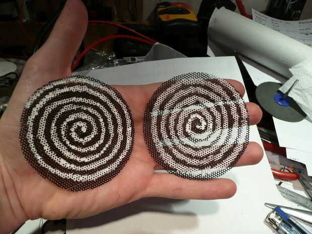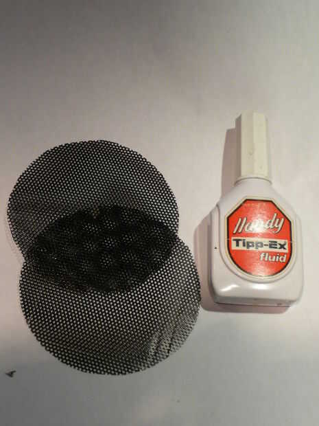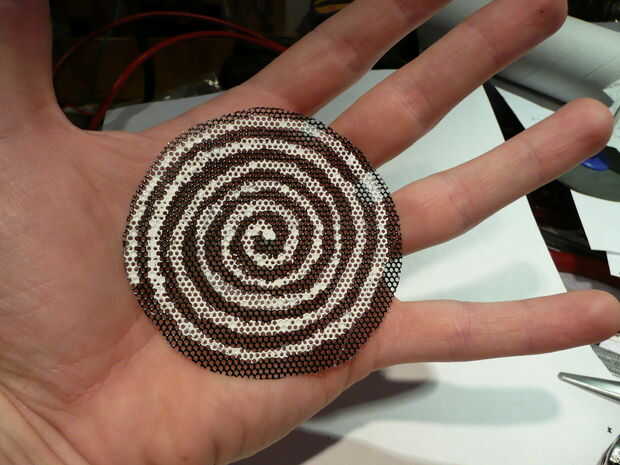 Poner una lámina de plástico para proteger la pantalla, aplicar el círculo de rejilla metálica arriba y dibujar la espiral con tippex.
