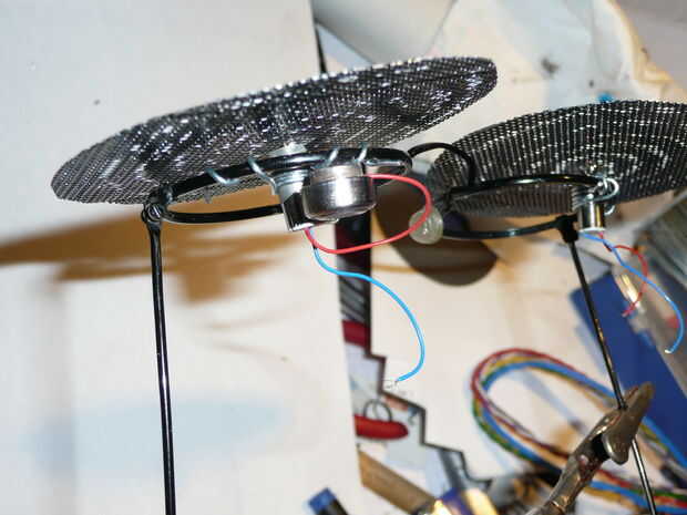 Tomar los imanes y las pilas de botón y atrapar los cables del motor entre cada lado de la célula y los imanes.