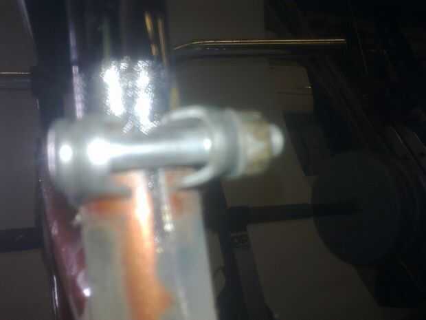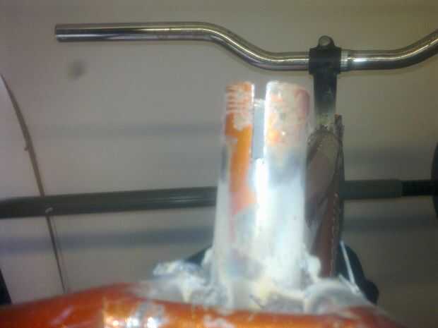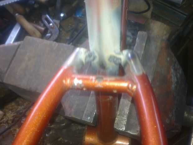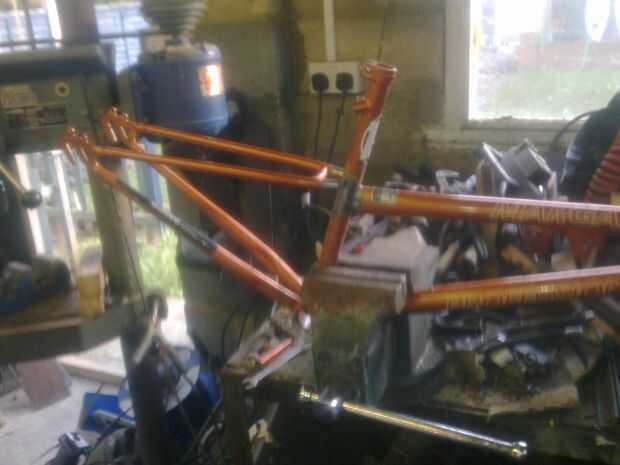 a continuación, corte los tirantes traseros por el tubo del asiento y les doblado por lo que fueron en el mismo nivel que la barra transversal. La pintura en las áreas de relevante fue tierra de con un cepillo de alambre montado la amoladora de ángulo. Las estancias fueron entonces rewelded. El tubo de sillín se corta con una sierra a una altura adecuada para un niño de seis años. Hacksawed dos ranuras en la parte posterior del tubo del asiento de unos 3 mm. y rompió el centro hacia fuera con un par de alicates de punta delgada a lijar para la abrazadera del asiento operar.