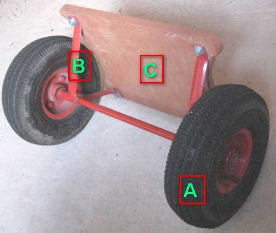 1 tomar las ruedas A y 2 conectar los soportes B aparte de la carretilla