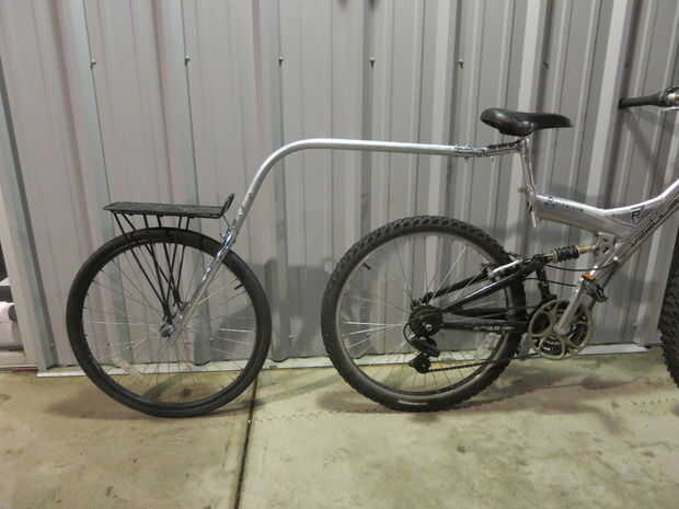este acoplado de la bici puede ser utilizado para transporte de materiales pesados o muy largos. También puede ser utilizado como carretilla de mano.Después de 2 años de uso, el enganche, los postes de conexión y los rodamientos se modificaron que ha