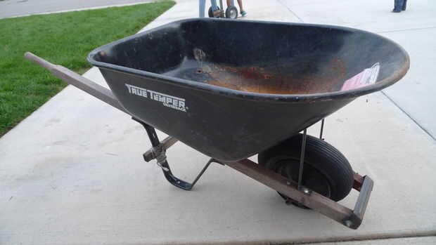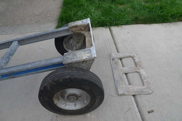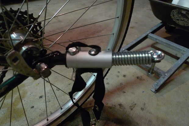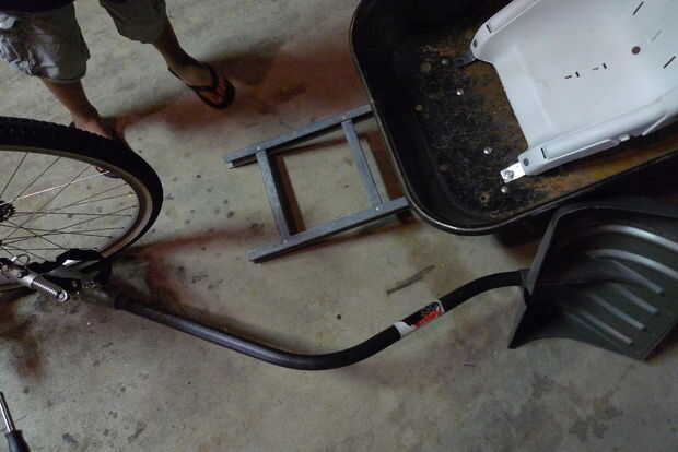 se trata de un remolque de bicicleta $10 venta de garage, aserrada por la mitad. Todo lo no ha bien atornillados, soldaduras. La verdadera rueda de la bicicleta original rueda hacia atrás en relación con la dirección que se rodó cuando la moto esta