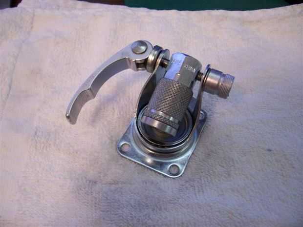 Inserte el conector rápido entre las horquillas de rueda la rueda y asegure con el perno de cabeza hexagonal cuarto pulgadas. Usé una cerradura perno que normalmente se encuentran en asientos de bicicleta en lugar de una cabeza hexagonal o el perno de carruaje. Una función es que cuando el perno se traba abajo las horquillas comprimirán y evitar que el mecanismo de liberación de conexión rápida de desplazamiento.