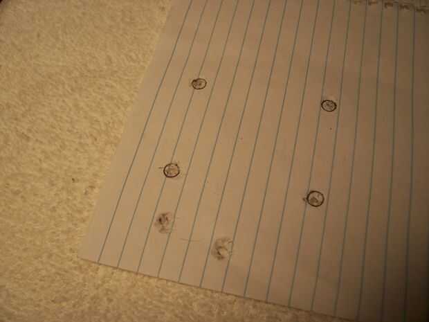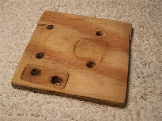Ahora con cinta adhesiva la tarjeta a un tres por tres pulgadas pedazo de tres ochos o madera contrachapada de media pulgada y perfore seis agujeros para comprobar ajuste y espacios libres.