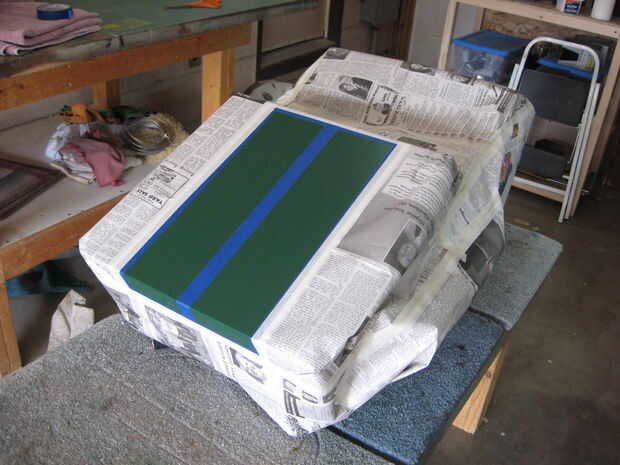 Esperé 24 horas después de la última capa base verde antes que grabó para la banda. Apliqué la capa de sellado de cinta verde, a continuación, tres capas de pintura blanca en aerosol, la luz esperando cerca de 10 minutos entre cada capa. Esperé 20 minutos después de la última capa antes de sacar el periódico y cinta.