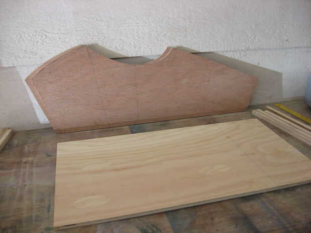 He trazado el perfil lateral en 1/4" madera contrachapada y cortar dos piezas coincidentes con una sierra de calar. La placa de fondo que crea la base del remolque es 16 1/2" de ancho y 30" de largo y fue hecha de madera contrachapada de 1/2".