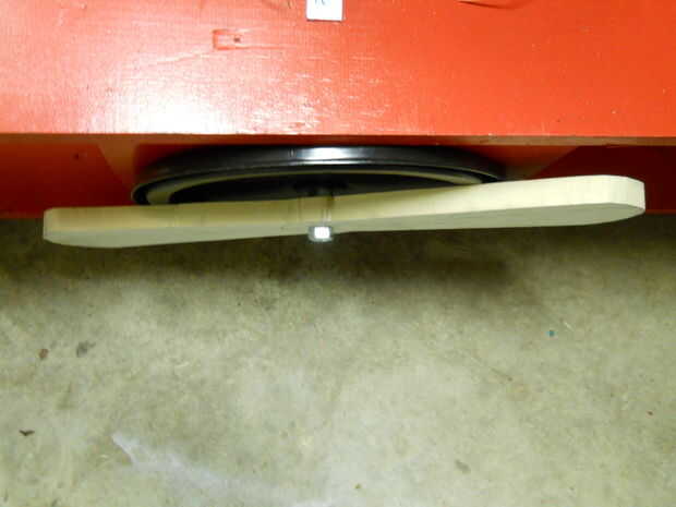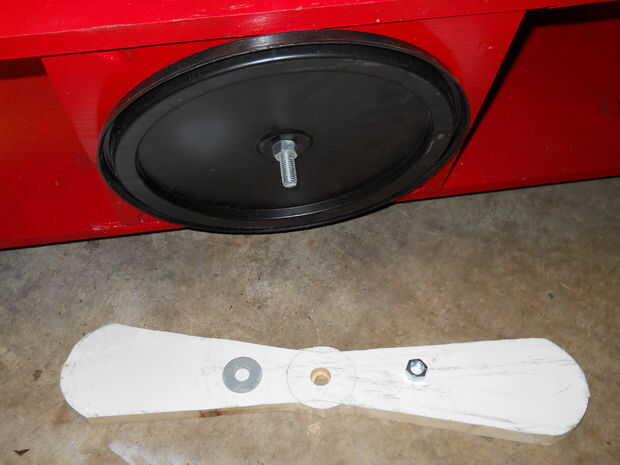 Al principio quería obtener lujo y utilizar apoyos reales en una tienda de hobby - aunque éstos tenían filos y me hizo pensar dos veces.  Luego fue la dirección opuesta y cortar un trozo grueso de madera para servir como mi apoyo.  Agarré una taza de la cocina y trazó dos círculos en los extremos.  Luego tomamos un vaso de jugo y había trazado en el centro.  Luego utilicé una regla para conectar las partes externas de los círculos en el centro.  Después corté la forma general, taladré un agujero en el centro con una broca de 3/4 de pulgada.  Entonces tomé un perno de tres pulgadas con una arandela guardabarros y había insertado en la parte delantera del avión desde el interior.  Luego coloqué una tuerca que sujete al bastidor.  Entonces me deslicé en la otra tapa del cubo con un agujero de 3/4 de pulgada perforado en el centro (esta pintado negro).  Después de eso, le pongo en otra tuerca de la hélice y luego otra tuerca - comencé a correr fuera de sala en el perno, por lo que planea reemplazar el perno de 3 pulgadas por cuatro pulgadas más adelante.