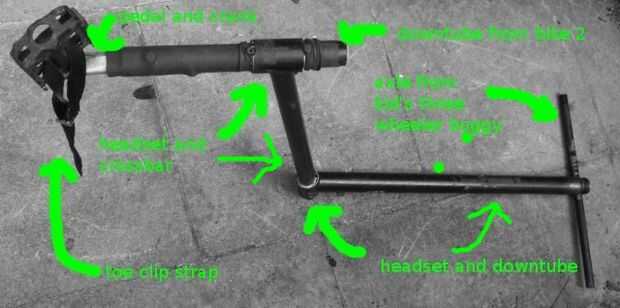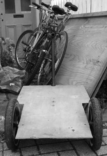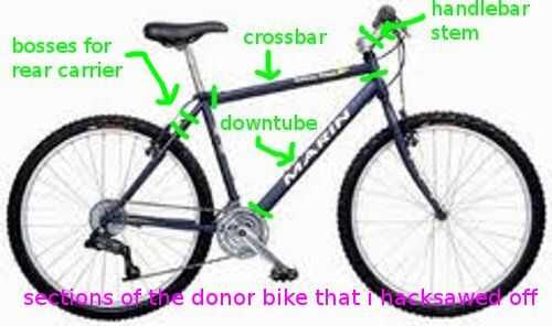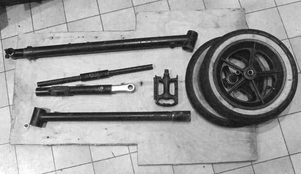 y construido con basura encontrado localmente, es decir, un buggy roto 3 ruedas, dos marcos de la bici y una hoja de madera contrachapada.