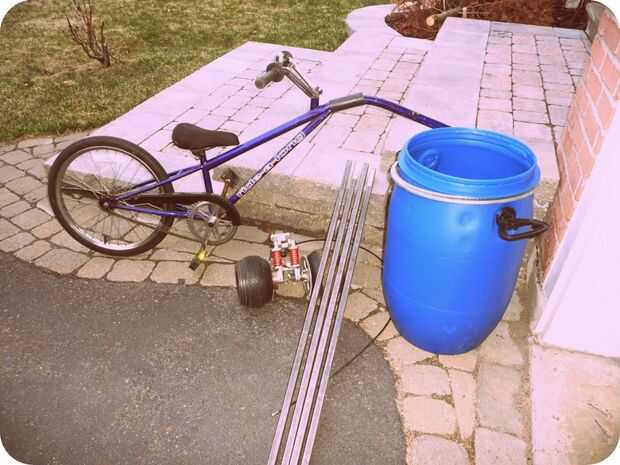 Para esta build fusionados con una etiqueta a lo largo (o paseo) cuadro de la bicicleta con un conjunto de ruedas y camiones desde una placa de césped. Luego fabricado una cesta de acero plano para un barril de 60 litros canoa.