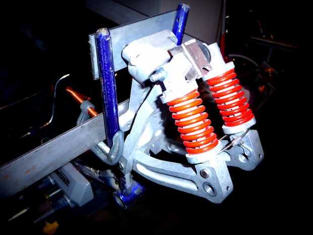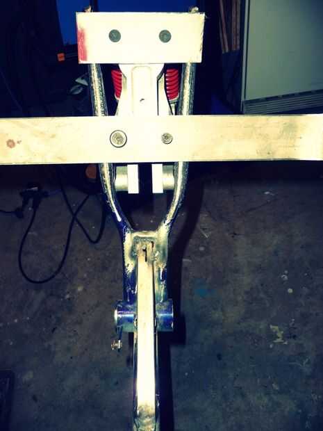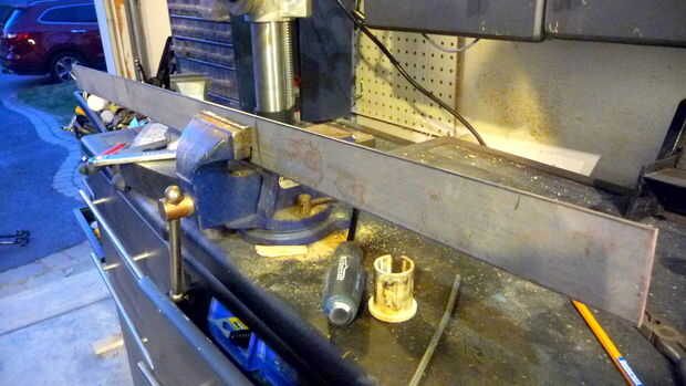 La colocación de acero y los agujeros para los camiones requiere una cuidadosa consideración. Desea la carga centrada sobre las ruedas, y en mi caso, el camión se acuña en la horquilla posterior por lo que no hay demasiadas posiciones correctas (un hecho). Compensó la pieza de acero plano que es paralelo a la estructura de aproximadamente una pulgada por lo que podría alinear de dos agujeros más. Una vez que esté seguro de la posición del acero, trace la posición de los agujeros en los camiones en el acero. Usé un taladro para completar los agujeros de perno.