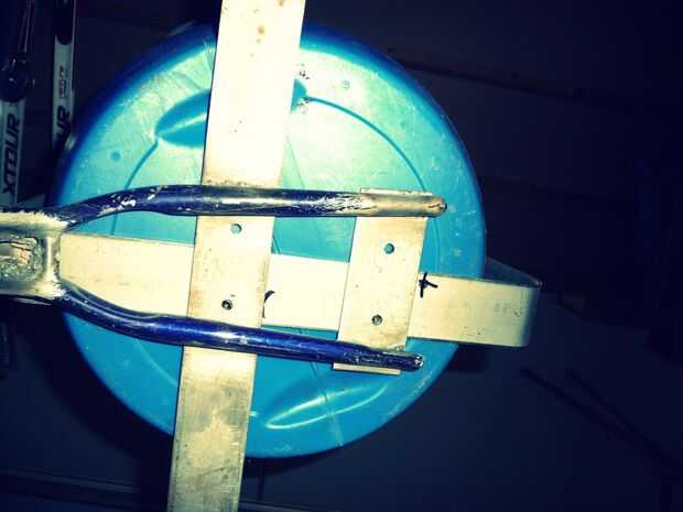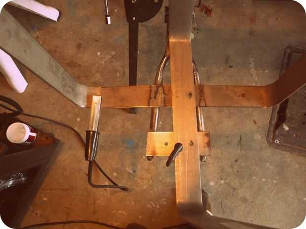 Me tomó un tiempo para averiguar cómo crear un receptáculo robusto para el cañón de la canoa. Terminé de doblar piezas de acero plano de 2 pulgadas a la anchura de la barrica. Estas piezas de acero plano también sirven de apoyo para los camiones Turfboard y solidifican la estructura general.