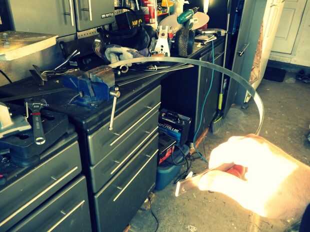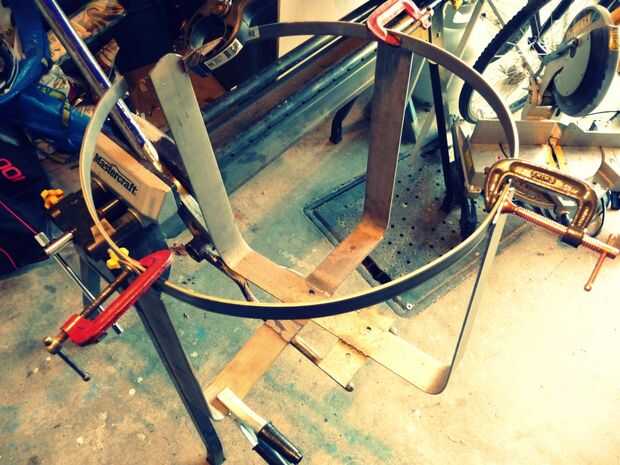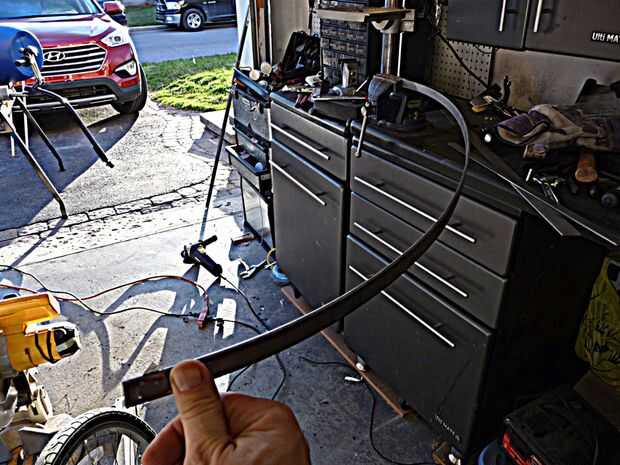 Mida la circunferencia del tubo y agregue 1 a 2 pulgadas para darte un pequeño búfer. Introduzca un extremo (media pulgada) en un tornillo de banco. Lentamente doble el acero hacia ti desde el otro extremo al mismo tiempo que acentúa la curvatura empujando desde el interior con la otra mano.