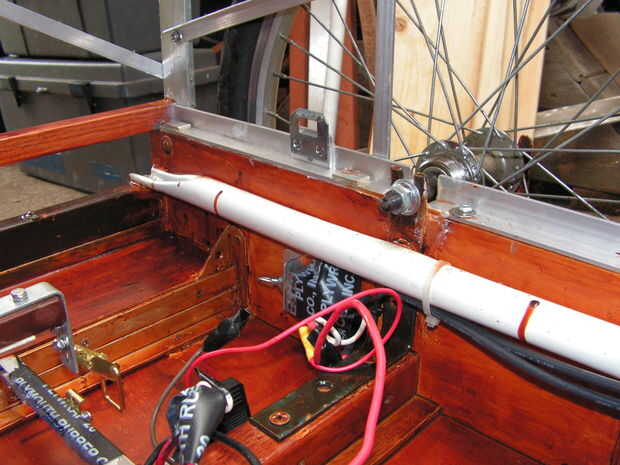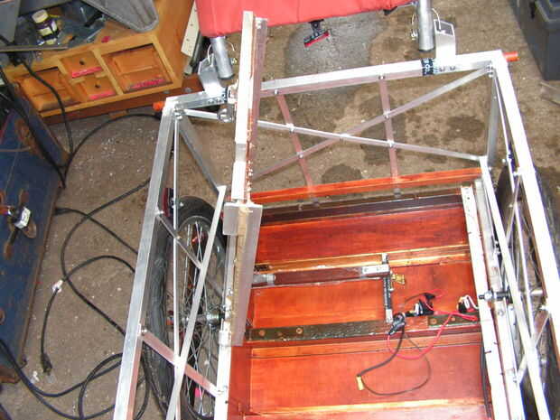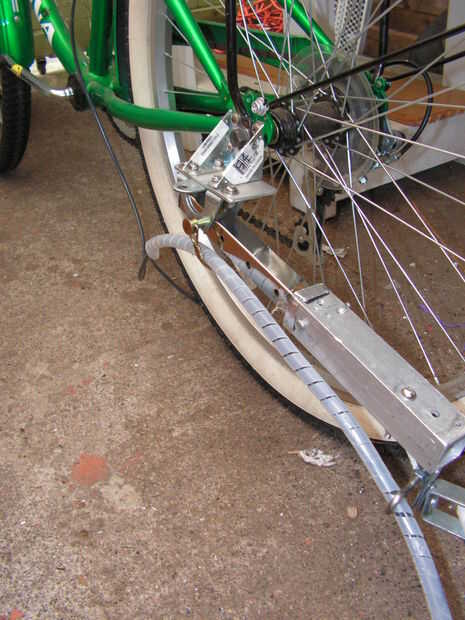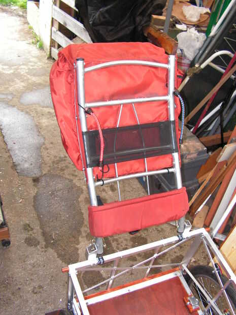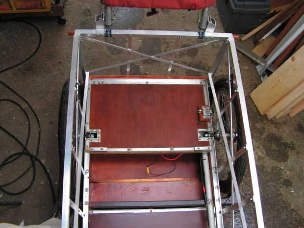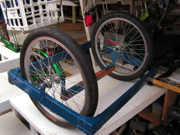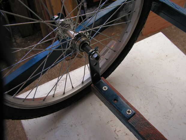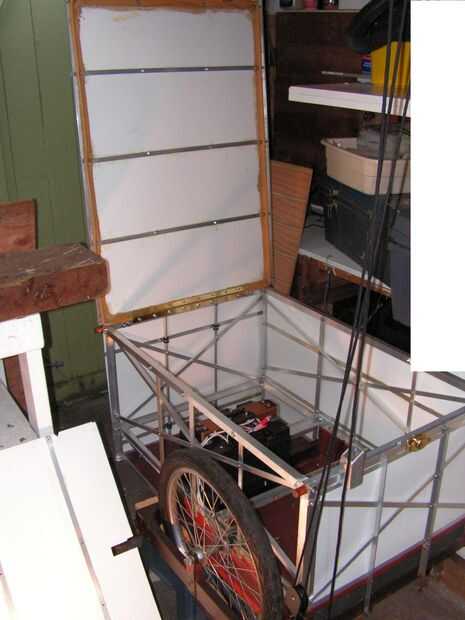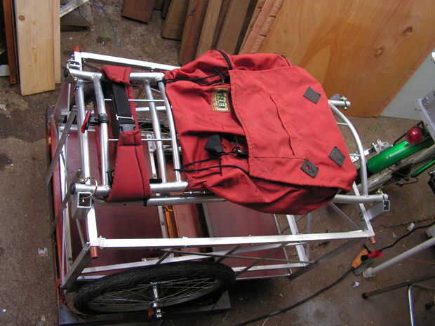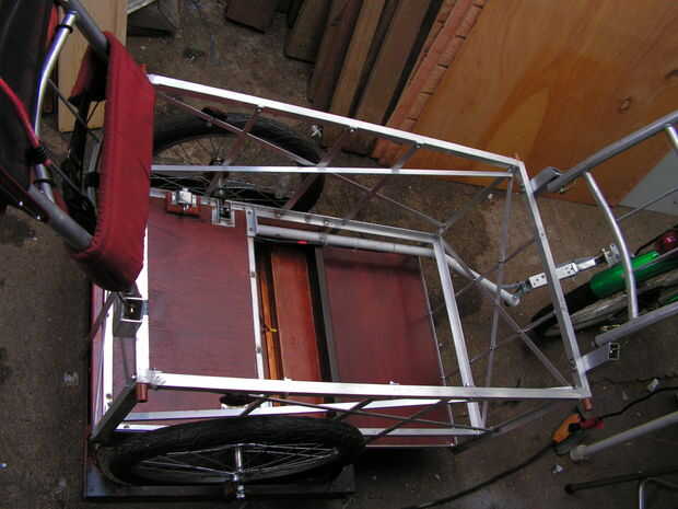 También utiliza algunos materiales reciclados y había añadido características opcionales usando nuevos materiales especiales. He utilizado un trozo de tubo de acero de una vieja tabla de planchar (pierna) como la conexión de ángulo entre el enganche de la bicicleta y la base del remolque. Usé una barra de acero de una vieja máquina de ejercicio en el enganche, pero que podrían comprar fácilmente. También, he dejado espacio abierto en la parte inferior de la base de un conjunto de tres pilas ya que le conecto mi remolque a mi bici eléctrica. Ver asistencia eléctrica como un lujo, no una necesidad. Las ruedas son 20" diámetro (desde bicis de BMX de reciclado), pero realmente pueden ser cualquier tamaño que te gusta, ya que el cuerpo principal puede ser construido para ajustarse a cualquier rueda de tamaño que tienes que poner todo. Dos reciclado marcos de mochila y algunos cables de tramo fueron utilizados como las tapas de un cargo, pero éstos, como las baterías son opcionales. Encontré una tapa de la parrilla de $10 que puede ser utilizada como cubierta de stataionary como adaptada para ser utilizado como una cubierta durante el uso.