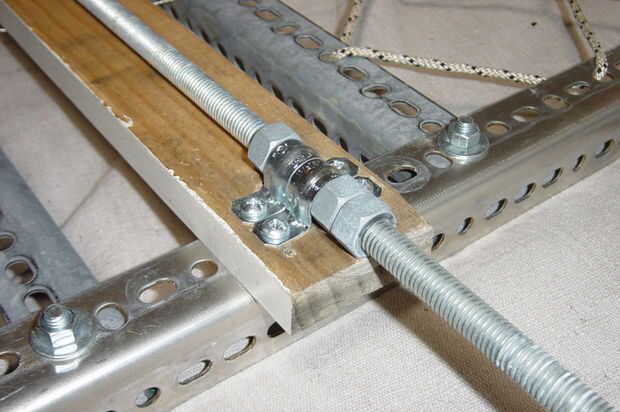 Antes de colocar el árbol, una 1/2 pulgada de la tuerca en la varilla roscada en primer lugar de la vuelta, luego dos arandelas de nylon (bujes). Girar dos más tuercas en la varilla roscada y la posición al lado de las correas de tubo como se muestra.