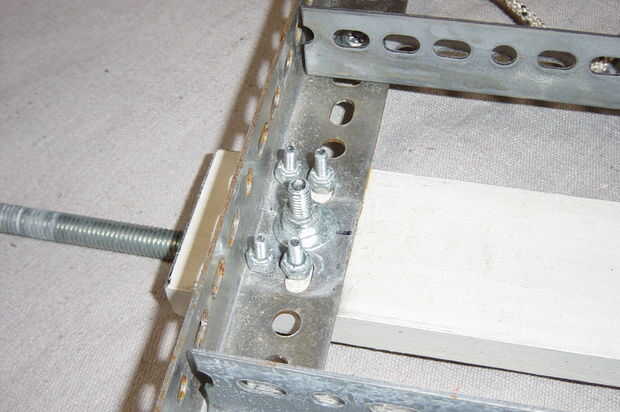 Perno de 1 x 3 al marco con un 1 1/2 pulgada tornillo hexagonal 5/16 largo. Usé una corte arandela y una tuerca con inserto de nylon, ya que es una conexión crucial. Usted tendrá que hundirse contra la cabeza de maleficio para que no interfiera con el eje.