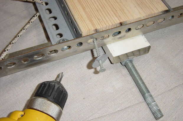 Aseguran 2 x 6 en su lugar utilizando tornillos para madera y arandelas de tope. Use cuatro tornillos en cada lado, dos en los extremos y dos en la parte inferior. Tenga cuidado aquí, partido de la primera 2 x 6 haciendo esto, por lo que recomiendo una perforación previa y no la apriete abajo mucho.