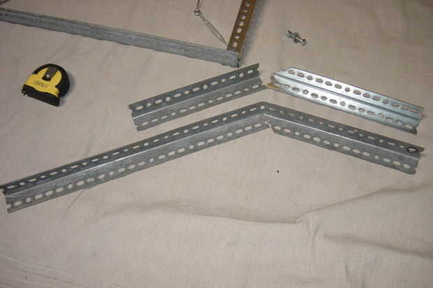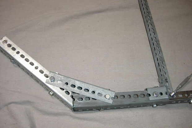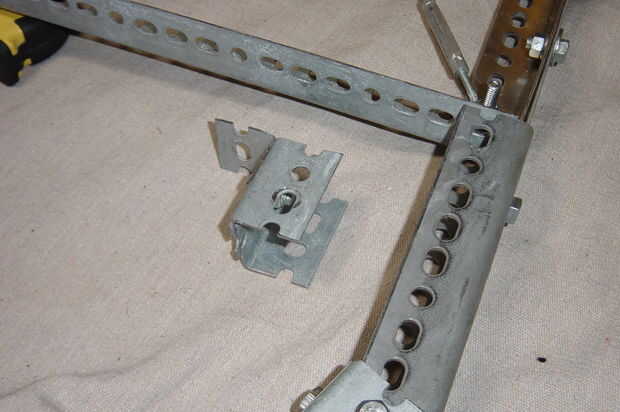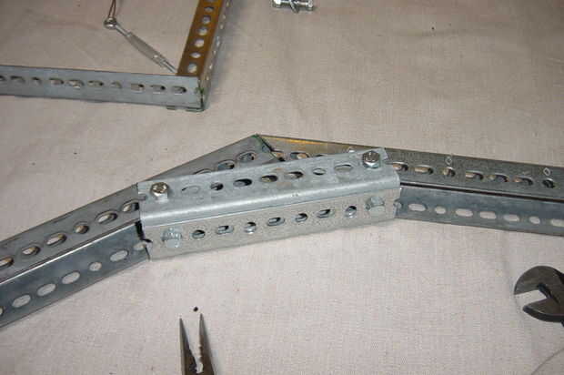 Una vez su satisfacción con el ángulo largo y plegado, corte dos trozos de ángulo de hierro para reforzar la lengua. El inferior es a 10 1/2 pulgadas y superior es de alrededor de 12 pulgadas. Perno de éstos a la lengua para formar una C en la sección.