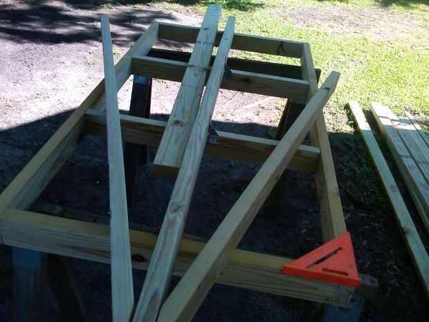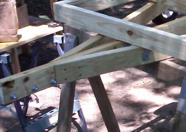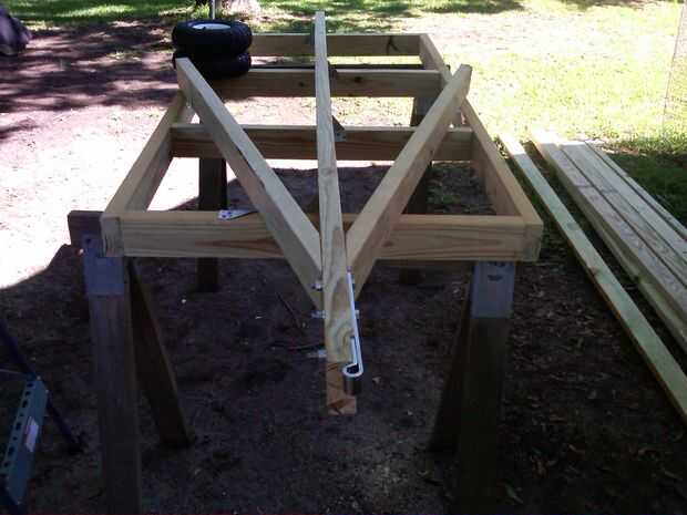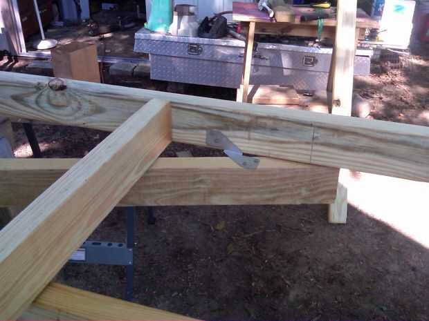 El primer cuadro sólo muestra cómo la puse hacia fuera. Ese ángulo en la lengua de la corte fue difícil para mí! Mido, marcados, medidos, comentó y logró que "suficientemente bueno". Tuve que atravesar, voltear el tablero, luego tratar de coincidir con el corte en la parte inferior otra vez. He asegurado con amarres de viga y toenailed tornillos de la cubierta.