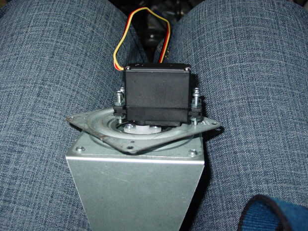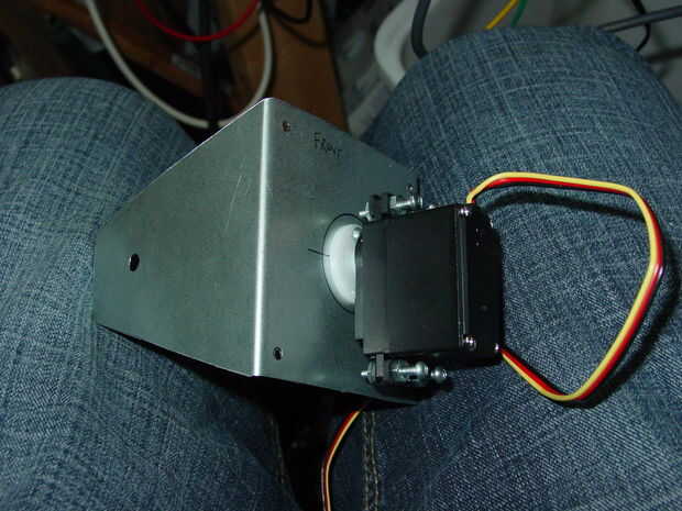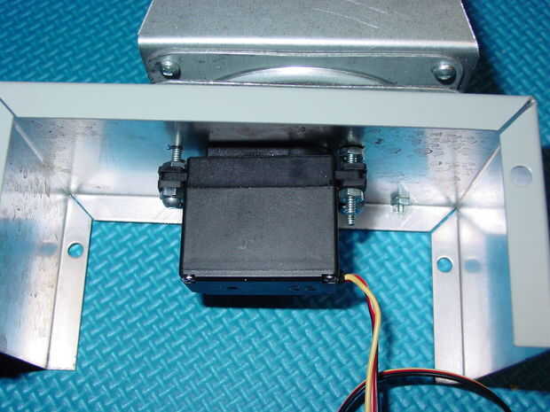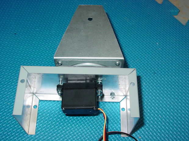 Coloque la base terminada en la parte superior de la caja de Hammond (o cubierta del recinto) y alinee los orificios de montaje. El cuerno del servo debe centrarse también en el agujero en el recinto.