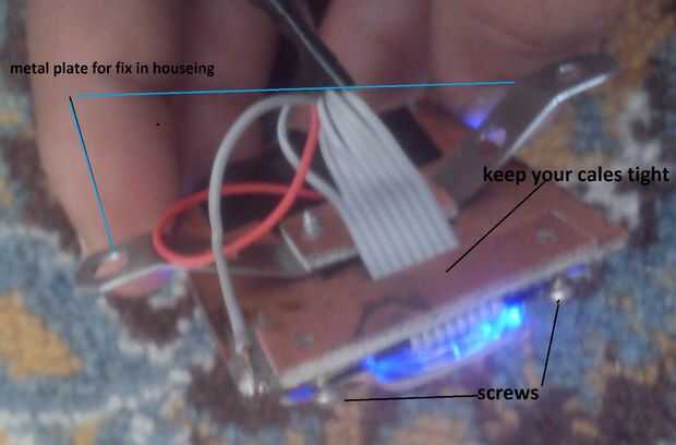 Fije la pantalla con su cubierta de metal en una placa con 4 tornillos en la parte superior (donde se hacen las conexiones) se fijan los cables con otro trozo de PCB y en el medio de la placa grande puse una hoja de metal que se fijan la pantalla en el caso remoto.