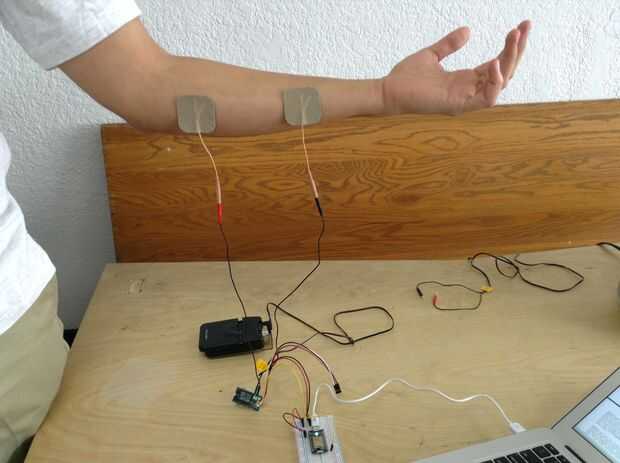 Conectar las dos decenas electrodos en todo el grupo muscular o del nervio que se desea estimular. El nervio cubital (http://en.wikipedia.org/wiki/Ulnar_nerve) es muy conveniente para estimular ya que es el nervio desprotegido más grande del cuerpo humano. Pasa por el codo y el antebrazo, así que coloque los electrodos como se muestra en la imagen. El nervio cubital está conectado directamente al dedo meñique y la mitad adyacente del dedo del anillo, así que debe esperar uno o dos de estos dedos para moverse cuando usted encienda su súbdito de cyborg.