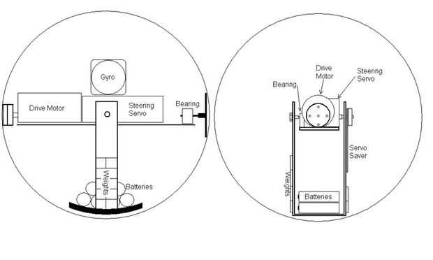 Aquí son planes dibujados ásperos de la bola. Tiene un giróscopo para el control de estabilidad, un servo para el volante y un motor de engranaje para la propulsión. Esta bola se mueve porque se mueve el peso en la parte inferior. Así, la idea es tener tanto peso como muy por debajo de la línea central como sea posible. LED o acero pesos se agregan para ayudar.